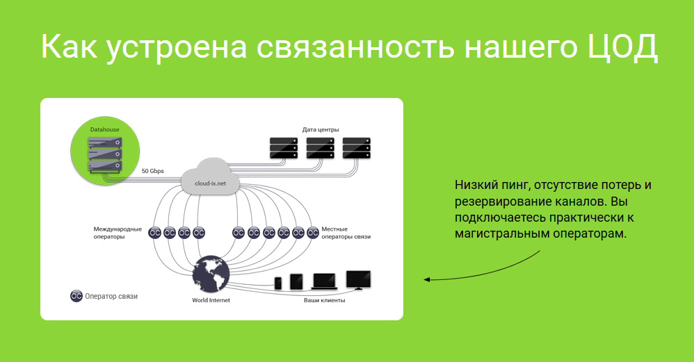 - Резервируемые каналы связи от магистральных сетей пропускной способностью до 100 Гбит/с