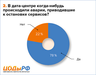 Как показал опрос, лишь немногим более 22 % компаний никогда не сталкивались с критическими сбоями, приводящими к остановке ЦОДа. Однако есть достаточные основания полагать, что эта цифра занижена, так как толкование термина «авария» может разниться. Следует отличать критические аварии, которые привели к полной остановке ЦОДа, и те, которые повлекли за собой лишь частичное нарушение функционирования систем или отдельных агрегатов. О последних нередко можно услышать в кулуарах, но многие компании считают, что раз подобные нештатные ситуации не привели к глобальным проблемам, то и считать авариями подобные инциденты не следует. Но не нужно забывать, что наиболее частое резервирование на агрегатном уровне допускает лишь единичный отказ с немедленными сервисными работами, что нередко игнорируется. В итоге «незначительные неполадки» накапливаются, выстраиваются в роковую цепочку событий и приводят к глобальным сбоям. Поэтому не стоит недооценивать любые инциденты — после его устранения необходимо уделить достаточно времени «разборам полетов», ведь авария может не просто повториться, а вызвать более серьезные последствия.