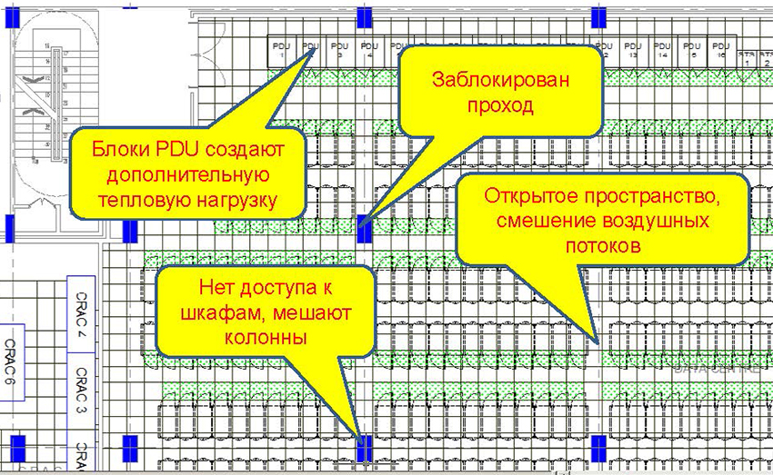 «1. Первое, что обращает на себя внимание: блоки распределения питания (PDU), расположенные таким образом, создадут дополнительную тепловую нагрузку. Они значительно удалены в пространстве от того оборудования, которое будут запитывать. Через весь ЦОД придется тянуть кабели системы электропитания, а чем они длиннее, тем больше сопротивление и тем большее количество энергии будет расходоваться впустую, в итоге переходя в тепловую форму. Кроме того, если кабели будут проложены под фальшполом, они могут препятствовать движению охлаждающего воздуха.